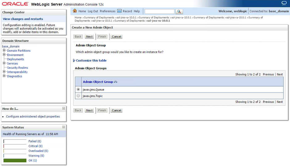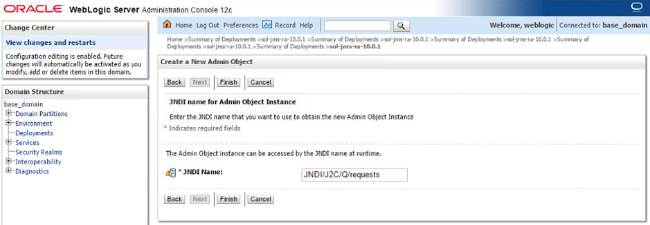 To enable the JMS clients to connect and look up the queue destination required by WebLogic Application Server, there are three JNDI objects required on the Solace event broker: