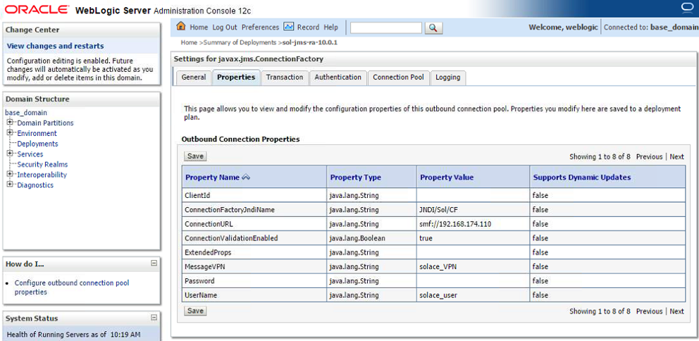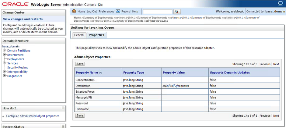 Note this document provides instructions on configuring and deploying the Solace JCA 1.5 resource adapter using the web console application of WebLogic, as well as instructions on configuring Solace as a Foreign JMS Provider Module. For detailed background on either Solace JMS or the WebLogic Application Server refer to the referenced documents below.